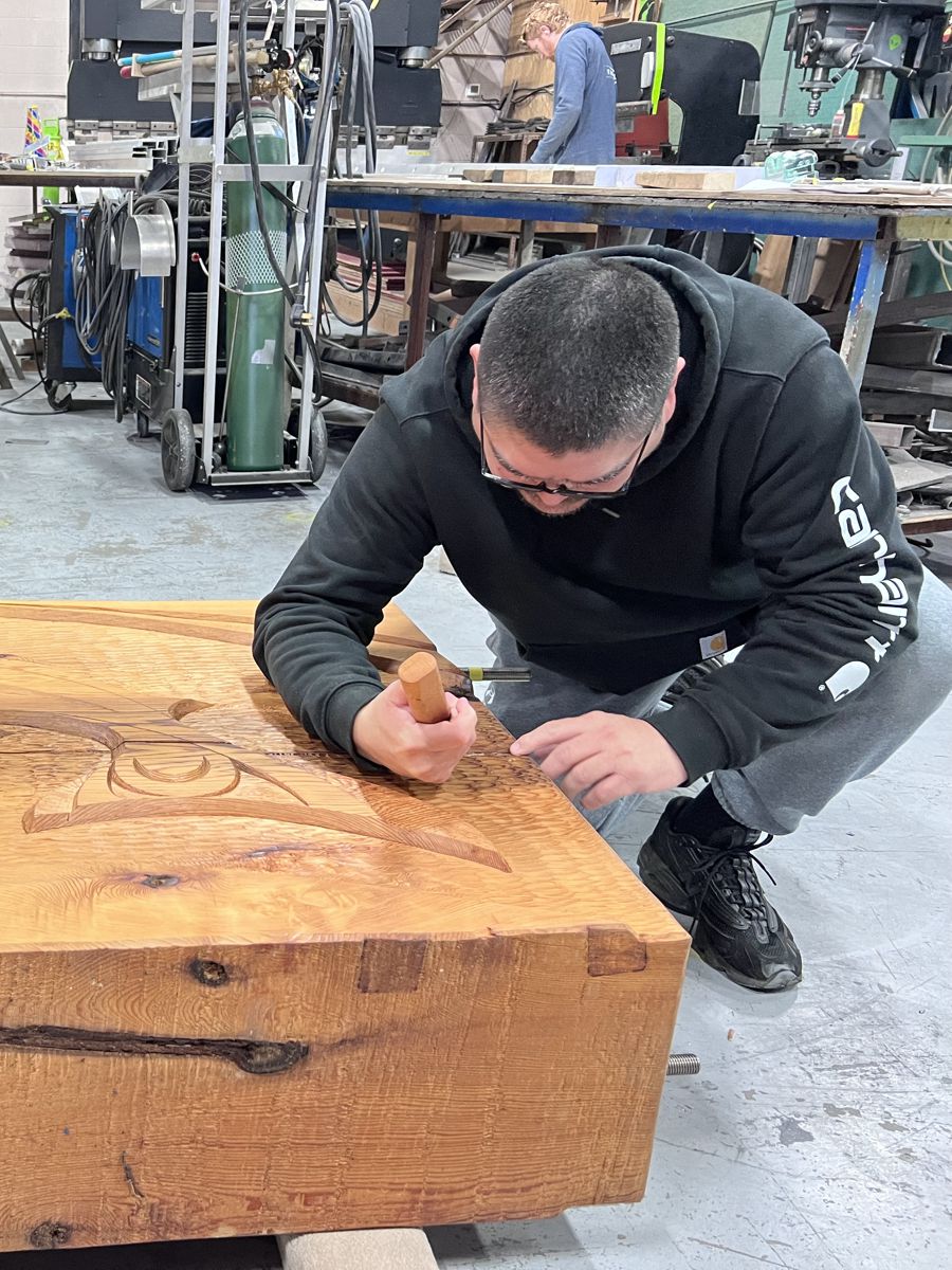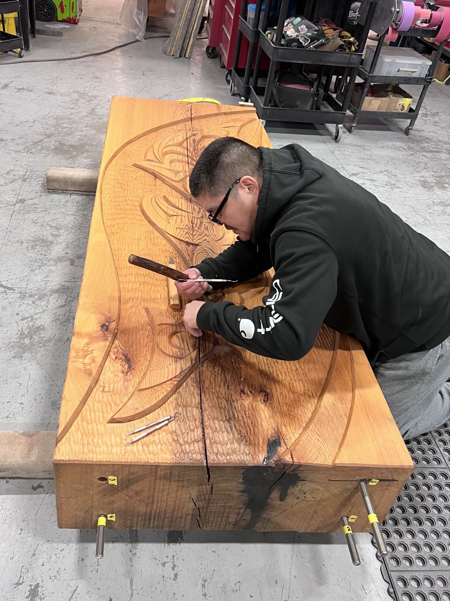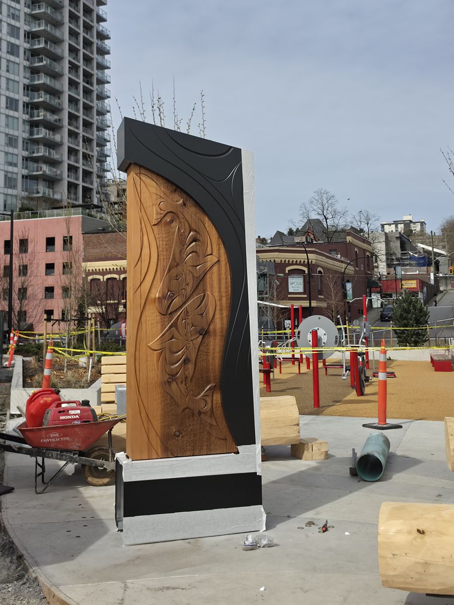 Each sculpture features hand-carved red cedar panels, one sculpture featuring salmon and the other a featuring sturgeon.