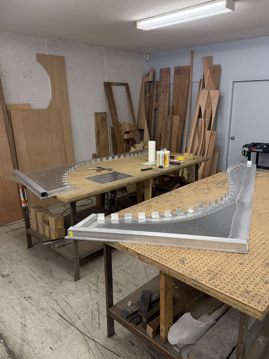 Materials: Solid welded aluminum, LED lighting, hand carved red cedar panels