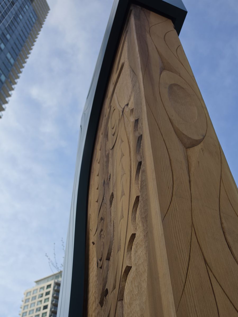 Coast Salish artists Kelly Cannell and Brent Sparrow collaborated on these two sculptures that now adorn the riverfront in New Westminster, BC.