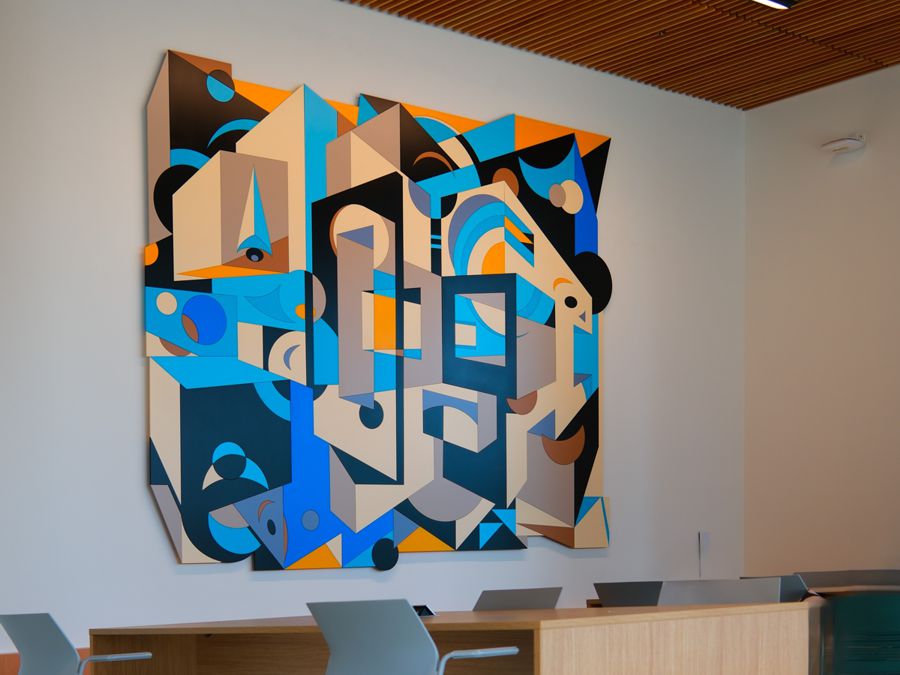 New Horizons by Susan Point draws on traditional Coast Salish motifs while expressing a contemporary vision of shared identity. Rooted in ancestral knowledge, the work reflects the vitality of modern Coast Salish culture and welcomes the diverse communities connected to the new Gateway Building at UBC.