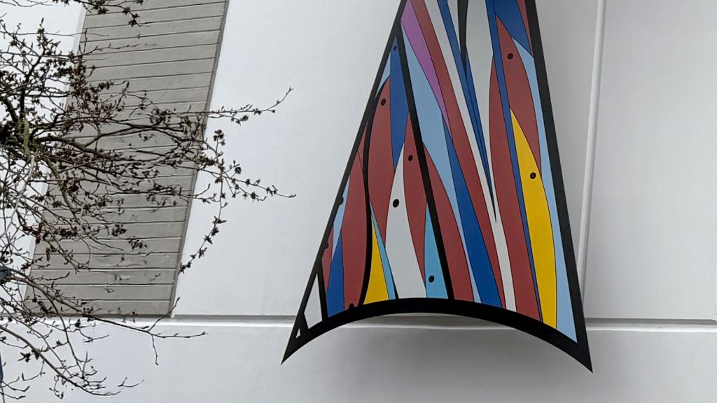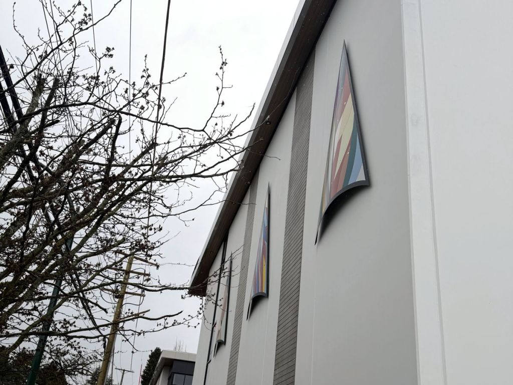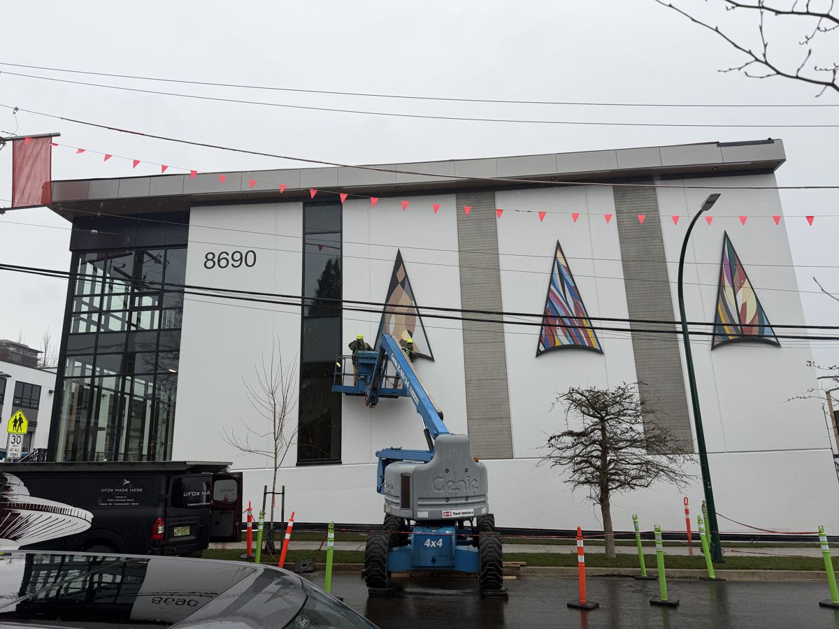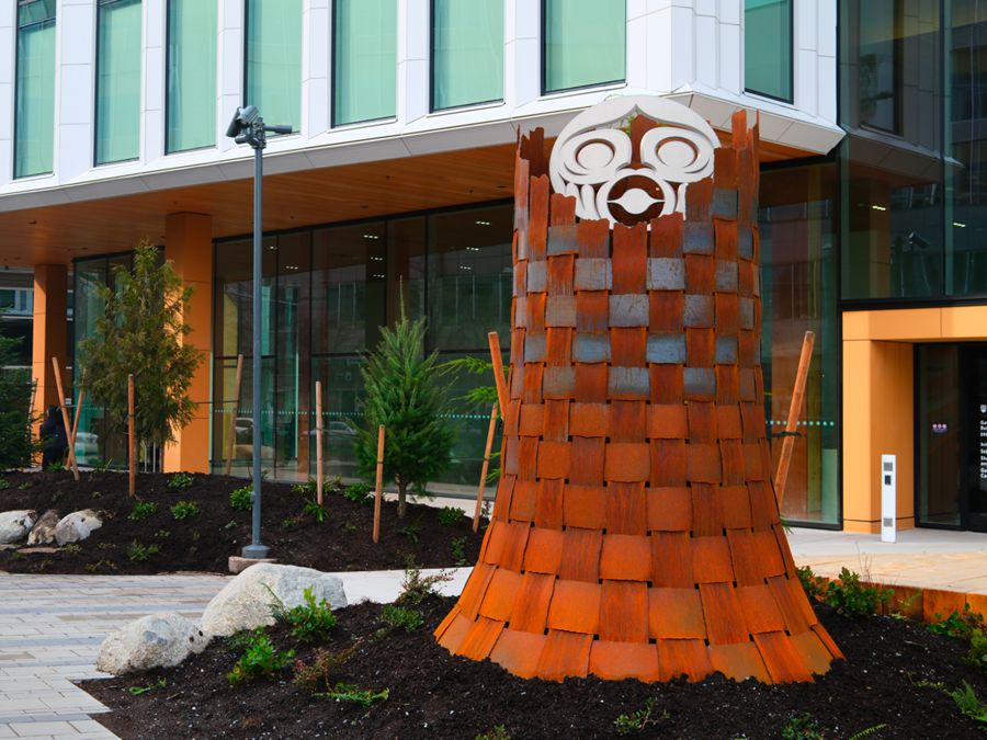 Combining traditional Coast Salish designs with a modern aesthetic, these large, vibrant panels adorn the side of a warehouse complex.